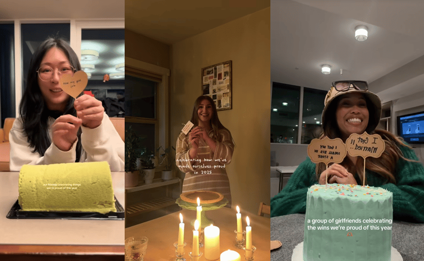 Este trend viene fuerte desde EE.UU. y es perfecto para LATAM: formato simple, tono honesto y un cierre de año más real que las típicas metas. La dinámica es visual y directa: cada persona escribe su logro y lo coloca como una banderita sobre un pastel. Es emotivo, rápido y muy compartible.
